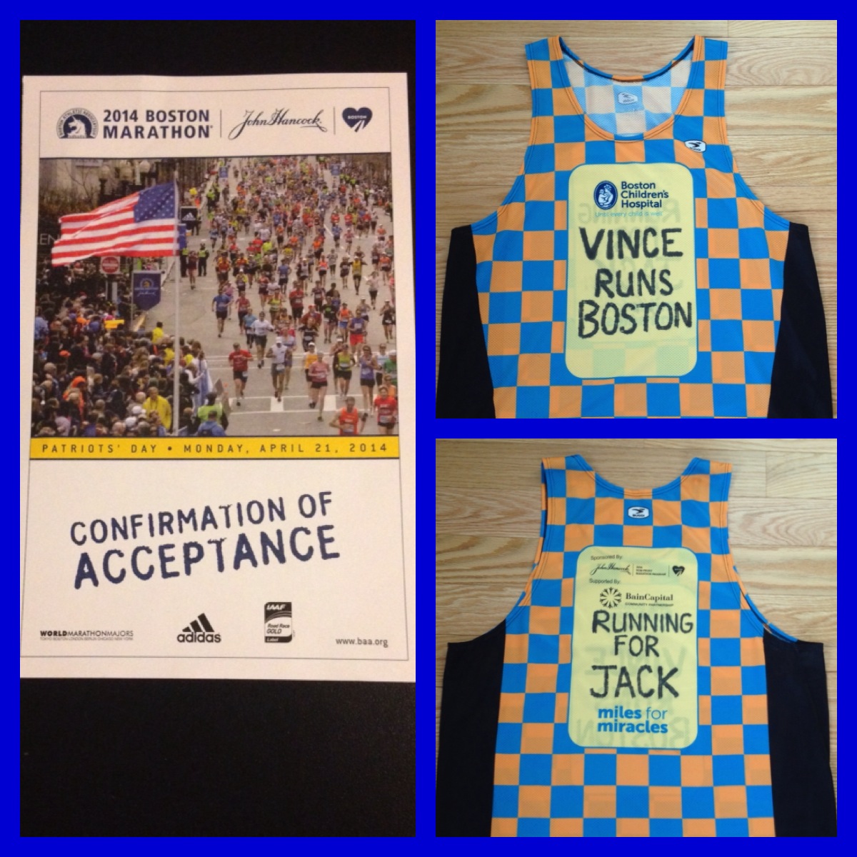 After receiving each package, I definitely had a moment where I felt chills all over my body and things got even more serious. My confirmation of acceptance made me think about the goal I set several years ago to run the Boston Marathon before I turned 30 – and now it’s happening. I also thought about last April and stating that I would run the 2014 Boston Marathon – and now it’s happening. My Miles for Miracles team jersey made me think about everything my Patient Partner Jack has been through – and running this for him. My jersey also made me think about everyone who has supported my run and donated to the cause – and running this with them. I think it’s safe to say, checking the mail has never given me such a whirlwind of emotions.
